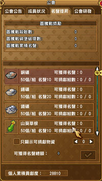 - 公會成員貢獻物資給公會,同時本身也可獲得貢獻值。