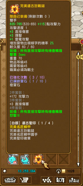 物品等級69級以下的裝備,武器增加攻擊力(法杖追加魔攻)、防具增加體力,強化次數越多、屬性增加越高,強化成功四次以上裝備會釋放亮光。 |