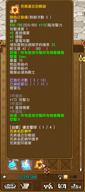 物品等級39級以下的裝備強化,武器增加攻擊力(法杖追加魔攻)、防具增加體力,強化次數越多、屬性增加越高,強化成功四次以上裝備會釋放亮光。 |