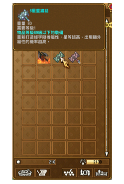 物品等級79級以下的裝備,重新打造綠字隨機屬性,星等越高、出現額外屬性的機率越高。 |
