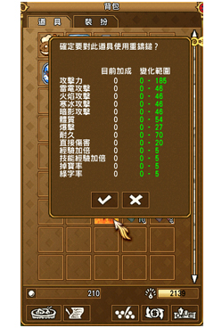 物品等級99級以下的裝備,重新打造綠字隨機屬性,星等越高、出現額外屬性的機率越高。 |