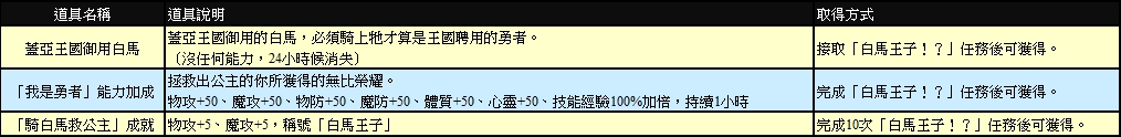 活動內容: 1. 玩家可在各城鎮找到「蓋亞王國特派使者」,並接取「白馬王子!?」任務,每日可解一次。 2. 接取任務後玩家會獲得任務用的「蓋亞王國御用白馬」,並依照玩家的等級被傳送到「亞特拉斯塔」各組樓層的第一層。 3. 玩家請從第1層開始往上攻略,到第10層後便會找到公主。 4. 當玩家騎著「蓋亞王國御用白馬」和公主講話後,再回到各城鎮找「蓋亞王國特派使者」回報任務。 5. 完成任務後便可獲得「我是勇者」的能力加成,完成10次任務後可額外獲得成就「騎白馬,救公主」。