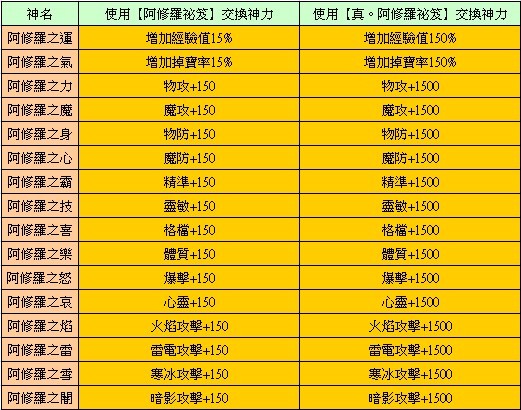 活動內容: 1. 來自【順天府】的【阿修羅】,決定運用自身神力,幫助小天使們踏上冒險。 2. 小天使跟【阿修羅】對話後可隨機獲得一個神力保護。 3. 如果使用【真。阿修羅祕笈】可以跟【阿修羅】交換更強大的神力保護。 4. 由於【阿修羅】有獨特的生活坐息,要請出來並不容易,所以只有每天晚間8點~10點會幫助小天使。 5. 在特定地區擊殺怪物可以取得【阿修羅祕笈碎片】,蒐集100個可以向【阿修羅】兌換1個【阿修羅祕笈】。