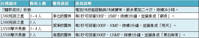 活動內容: 1. 組成三人以上隊伍,找月影林地或奧林帕斯山的「道士學徒」接取任務。 2. 打倒任務副本的最後一隻王後,周遭隱藏的「邪咒物品」將會出現。 3.「邪咒物品」移除成功後就能和附近的「詭異的氣息」對話,並且發現「邪魔妖道」怪物。 4. 驅邪結束即可獲得成功狀態及兌換用露珠。