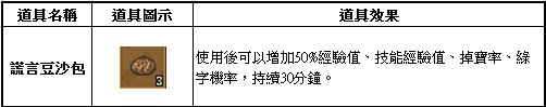 活動內容: 活動期間內,全地圖打怪都有機率獲得「謊言豆沙包」。 收集一定數量的「謊言豆沙包」還可向余仁傑兌換神奇效果的謝禮唷!